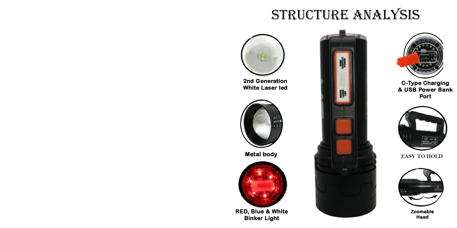 RENMAX Rechargeable Search Zoom Focus Torch High Brightness 500W 3Km Range High/Low/Blinker & Tail Light (White/Red-Blue Blinker) Waterproof 4-8 Hours Working Metal Body Black -1Pc