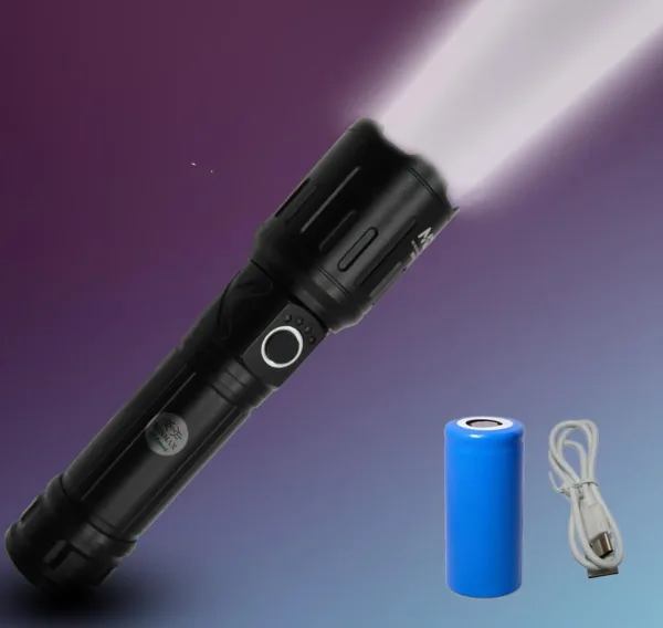 Featuring a rainproof design, this torch can withstand wet weather conditions, making it perfect for camping, hiking, or other outdoor activities. The rechargeable 4800mAh Li-ion battery ensures long-lasting performance and can be easily charged using the included charging cable.